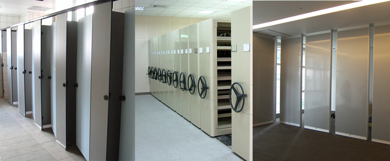 浴廁隔間、萬向滑動隔間、專業門扇、各式物料鋼架以及各型移動儲櫃等設計規劃